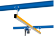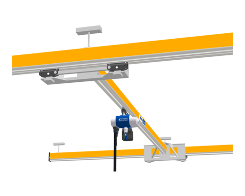 Wenn die Bauhöhe des EHB nicht ausreicht, ist der EHB-X die Antwort. Bei diesem Einträgerkran läuft der Kranträger nicht unter, sondern zwischen der Kranbahn. Der gesamte Kran hat so nur die Höhe eines einzelnen Profils. So wird eine deutlich verbesserte Hubhöhe erreicht, die beispielsweise auch hochbauende Maschinen im Förderbereich überwinden kann.