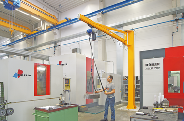 Typisch für den Säulenschwenkkran LS ist die Unterstützung von Hebeaufgaben, meist im niedrigeren Tragfähigkeitsbereich. Lasten lassen sich schnell und sicher aufnehmen und durch den leichtgängigen Ausleger kraftschonend und präzise umsetzen.