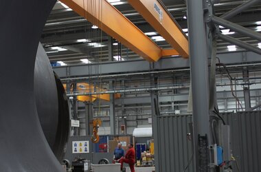 Eine ganze Reihe von ABUS Zweiträgerlaufkranen ZLK mit Traglasten von 20, 32, 40 und 63 t unterstützt die Fertigung der Windenergieanlagen und Röhren. Ein Teil dieser Krane wurde mit Tränenblechlaufstegen entlang der Hauptträger ausgerüstet, um den Service an den Hebezeugen auf höchstem Niveau sicherzustellen. Einige Krane wurden mit Federkabeltrommeln versehen, die die Stromversorgung von Lasthebemagnettraversen über einen Anschluss am Kranlasthaken ermöglichen. Die Krane mit Traglasten von 63 t arbeiten per Funkfernsteuerung im Tandembetrieb und sind mit einer Sicherheitsrückkopplung ausgerüstet, so dass ein Kran dieses Kranpaars jeweils die Funktionen des anderen Krans perfekt spiegelt. Wird zum Beispiel bei einem Kran der Sicherheitsgrenzschalter ausgelöst und die Geschwindigkeit reduziert, so verlangsamt sich der andere Kran ebenso. Damit wird gewährleistet, dass die Last, die von beiden Kranen im Tandembetrieb bewegt wurde, sicher transportiert wird.