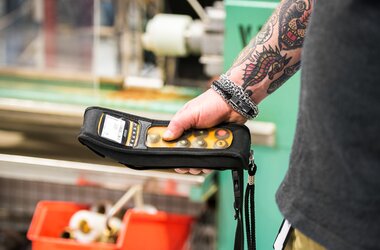 Der Kran bei RISE wird mittels der Funksteuerung ABURemote bedient: so hat der Kranbediener die Last von einem unabhängigen Standpunkt aus stets im Blick und kann sie sicher verfahren. Alle Neukrane, die mit der Kransteuerung ABUControl ausgerüstet sind, sind stets auch mit der Funksteuerung ABURemote ausgestattet: entweder als ergonomisch geformter Handsender ABURemote Button wie im Anwendungsfall bei RISE oder als Meisterschalter-System ABURemote Joystick. Beiden Funksteuerungen gemein ist u.a. die moderne intuitive Menüführung.