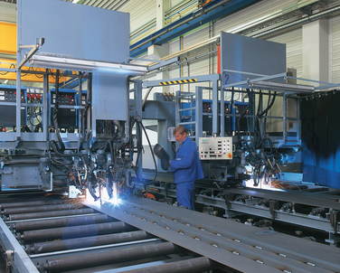 Ober- und Untergurt sowie die Katzschienen werden ebenfalls automatisiert angeschweißt. ABUS hat hierfür eine Portalschweißanlage entwickelt, die bis zu sechs Nähte in konstanter Qualität gleichzeitig schweißt. Bei Laufkranen aus Walzprofilträgern entfallen diese Schritte und es folgt lediglich das Ablängen und die Vorbereitung für die verschiedenen Krananschlussvarianten durch Anschweißen der Hauptträgeranschlussplatten.